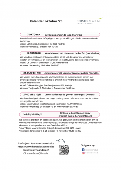 HerstelAcademie voorziet een open cursusaanbod rond maatschappelijke thema’s, welbevinden en psychisch welzijn. De cursussen zijn kortlopend en worden begeleid door een professional en een ervaringswerker, waarbij de nadruk ligt op samen leren.